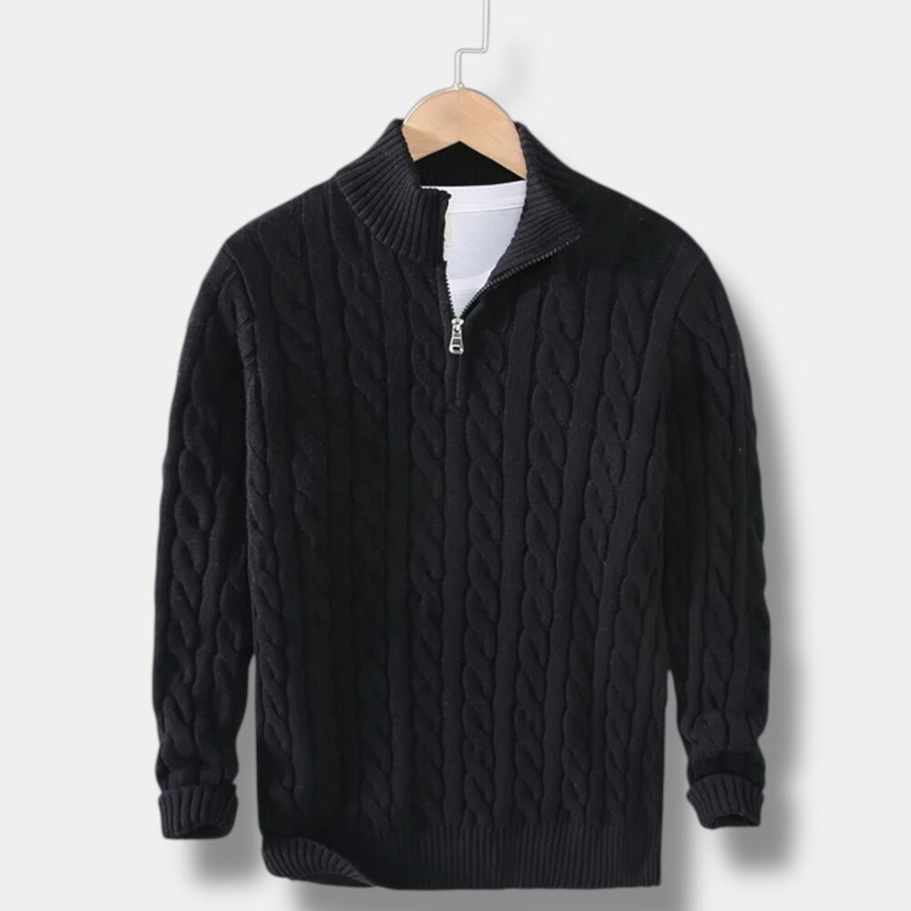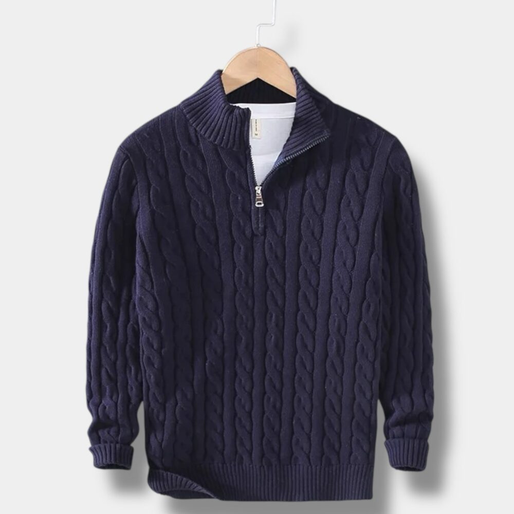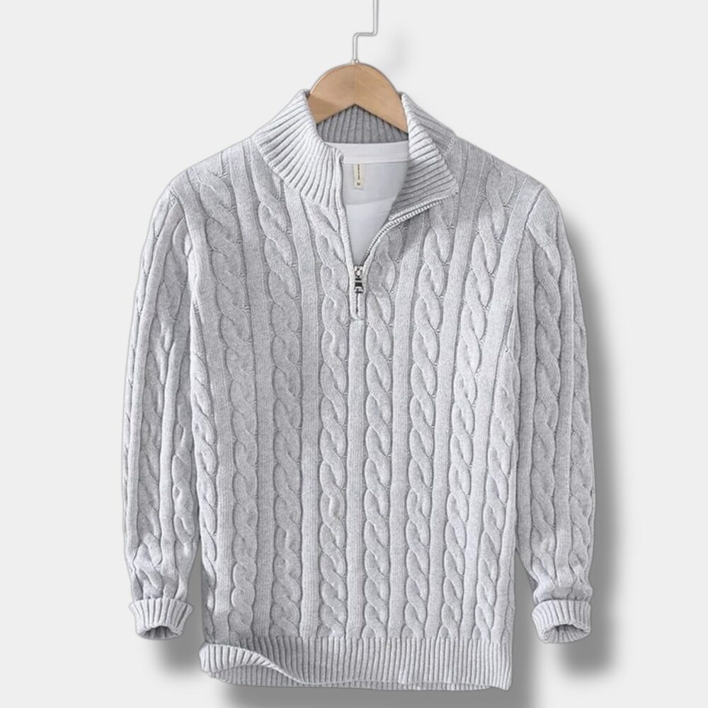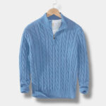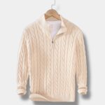 To sweter, który wybrałby nowoczesny mężczyzna w stylu Old Money: tekstura żakardowa, wyróżniający półgolf i elegancki metalowy pół-zamek. Zainspirowany klasycznymi kodami stylu, ten model łączy luksus z niewymuszoną elegancją. Zestawiaj z chinosami lub lnianymi spodniami — w każdej wersji podniesie poziom Twojego stylu.